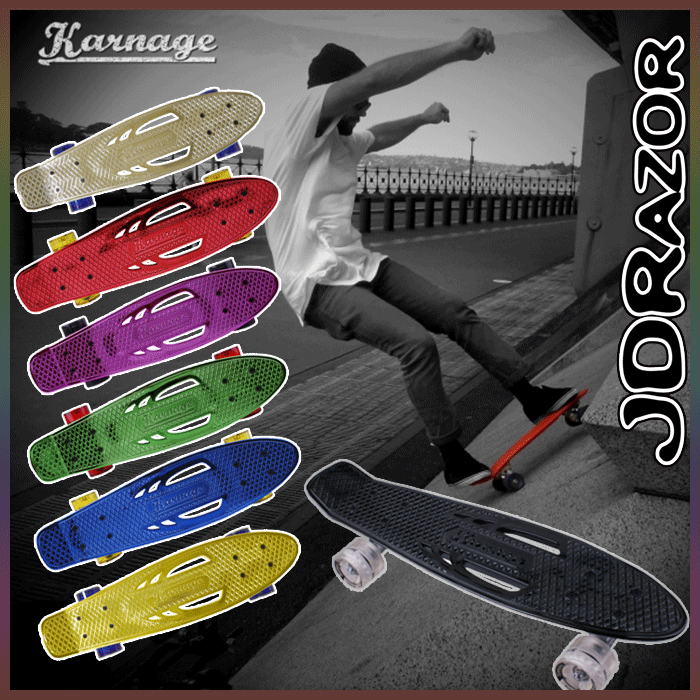 耐荷重100kg!小型スケボー 商品名 JDジャパン 【Karnage(カーネージ) KNG-23】 子供用スケボー カラー ブルー グリーン ピンク レッド シルバー ブラック ゴールド JANコード BLUE 4528265427197 RED 4528265427203 GREEN 4528265427210 PINK 4528265427227 SILVER 4528265427234 GOLD 4528265427241 BLACK 4528265427258 スペック サイズ(約):L570×W150×H100mm 重量(約):1.8kg 耐荷重(目安):100kg 推奨年齢(目安):5歳〜 ベアリング:abec7(made in USA) デッキ部分:クロームメッキ ※仕様は予告なく変更となる場合がございます。
