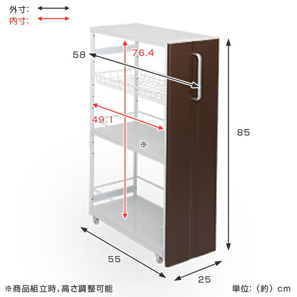 サイズ約 幅25×奥行55×高さ85(cm)梱包重量:約6.63kg内容量2台材質前面パネル・固定棚(上中下)・可動棚: スチールに粉体塗装フレーム:スチール鋼管に粉体塗装ガード:スチール丸棒に粉体塗装取っ手:ABS樹脂に溶剤塗装ガード受け・前面パネルキャップ:PP樹脂キャスター:スチール(ユニクロメッキ)+PA6樹脂生産国中国製備考組立商品耐荷重:棚板は1枚あたり8kgまで、ワイヤーカゴ棚は1個あたり5kgまで。