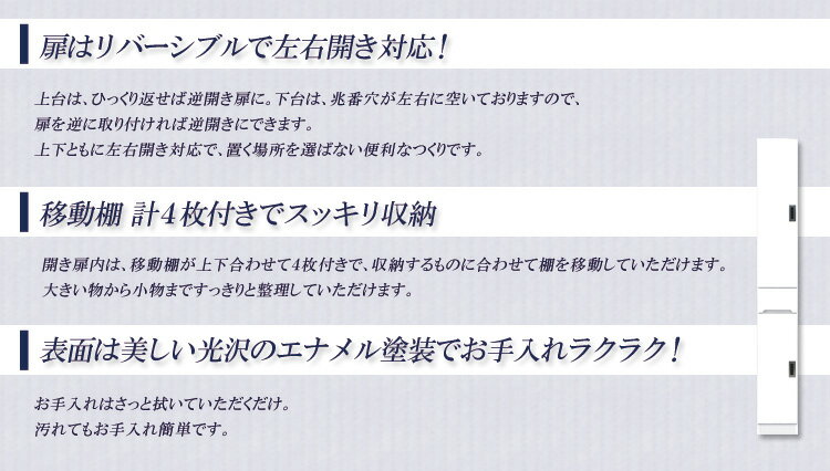 サイズ幅25cm x 奥行き40cm x 高さ180cm 素材MDFエナメル塗装 カラーホワイト 仕様開き戸(左右開き対応)国産 備考移動棚 計4枚付き*こちらの商品はメーカーからの取り寄せとなります。