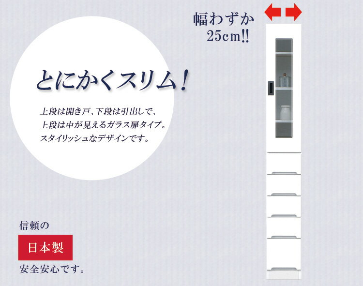 メーカー希望小売価格はメーカーカタログに基づいて掲載しています隙間収納 すきま収納 幅25cm 食器棚 スリム食器棚 ホワイト 開き戸タイプ ガラス扉 スリム 引出し付き キッチンボード キッチン収納 ダイニングボード 収納 木製 キッチン 洗面所 玄関 国産 可動棚 送料無料